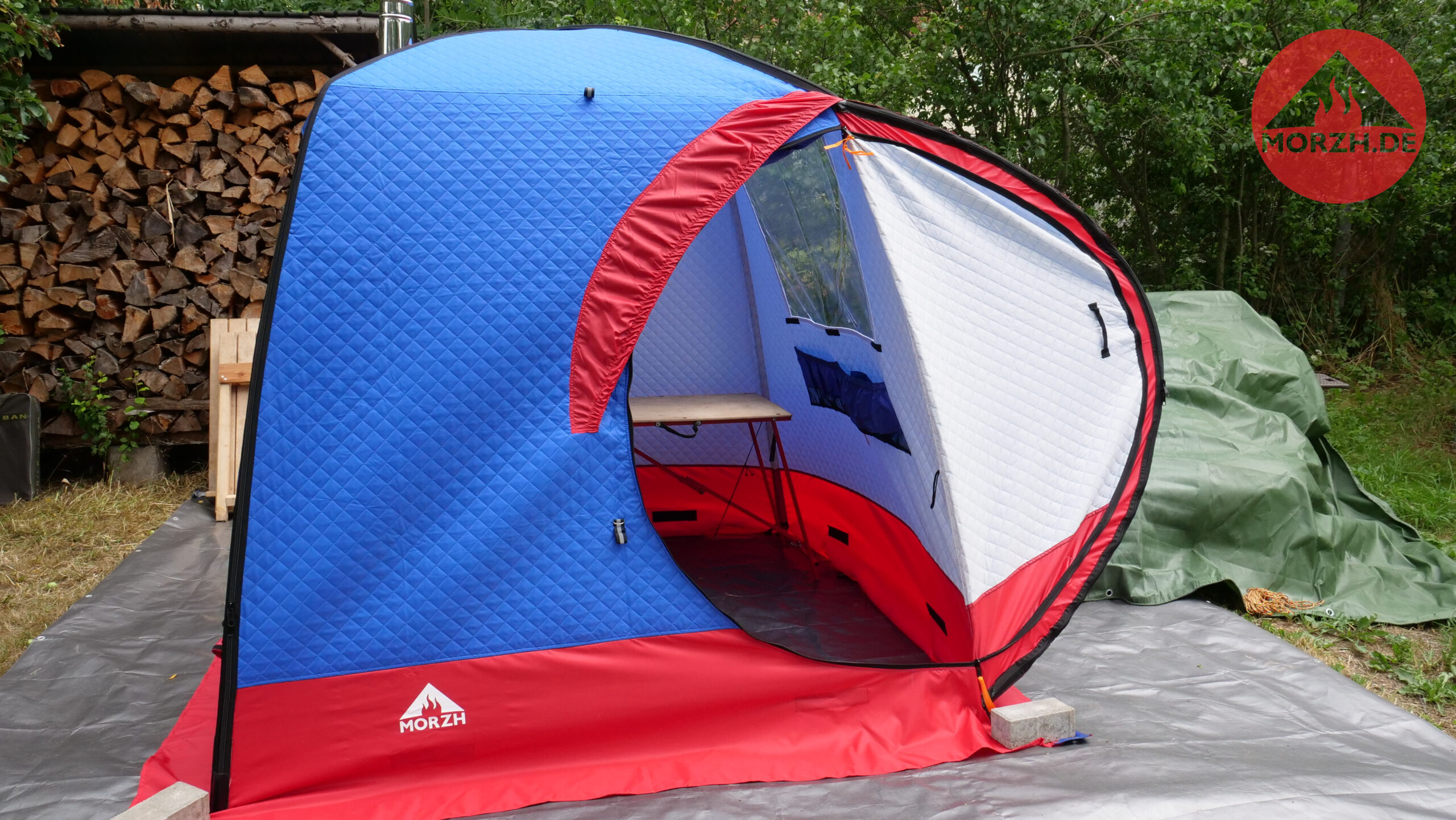 Wenn gewünscht kann die praktische Schwingtür mit einem Reißverschluß zusätzlich geschlossen werden, so das auch einer Übernachtung im freien zur Winterzeit nichts im Wege steht. Dazu wäre allerdings der Dauerbrandofen Fisher besser geeignet. Mann muss einfach seltener nachlegen und kann die Temperatur besser regeln. Sehr nützlich ist auch die zusätzliche Dachplane, die einen erhöhten Regenschutz gewährleistet.
