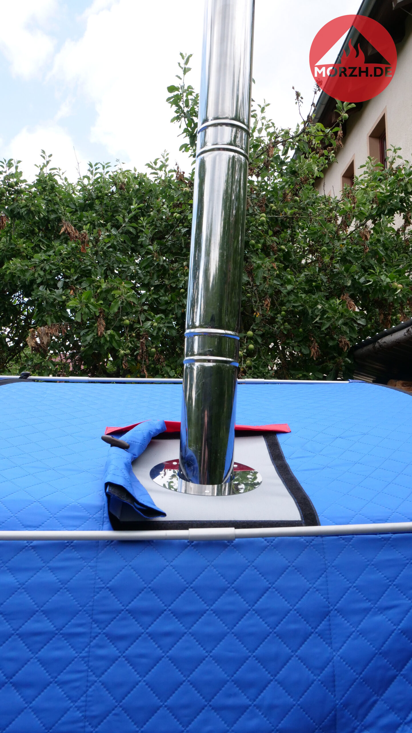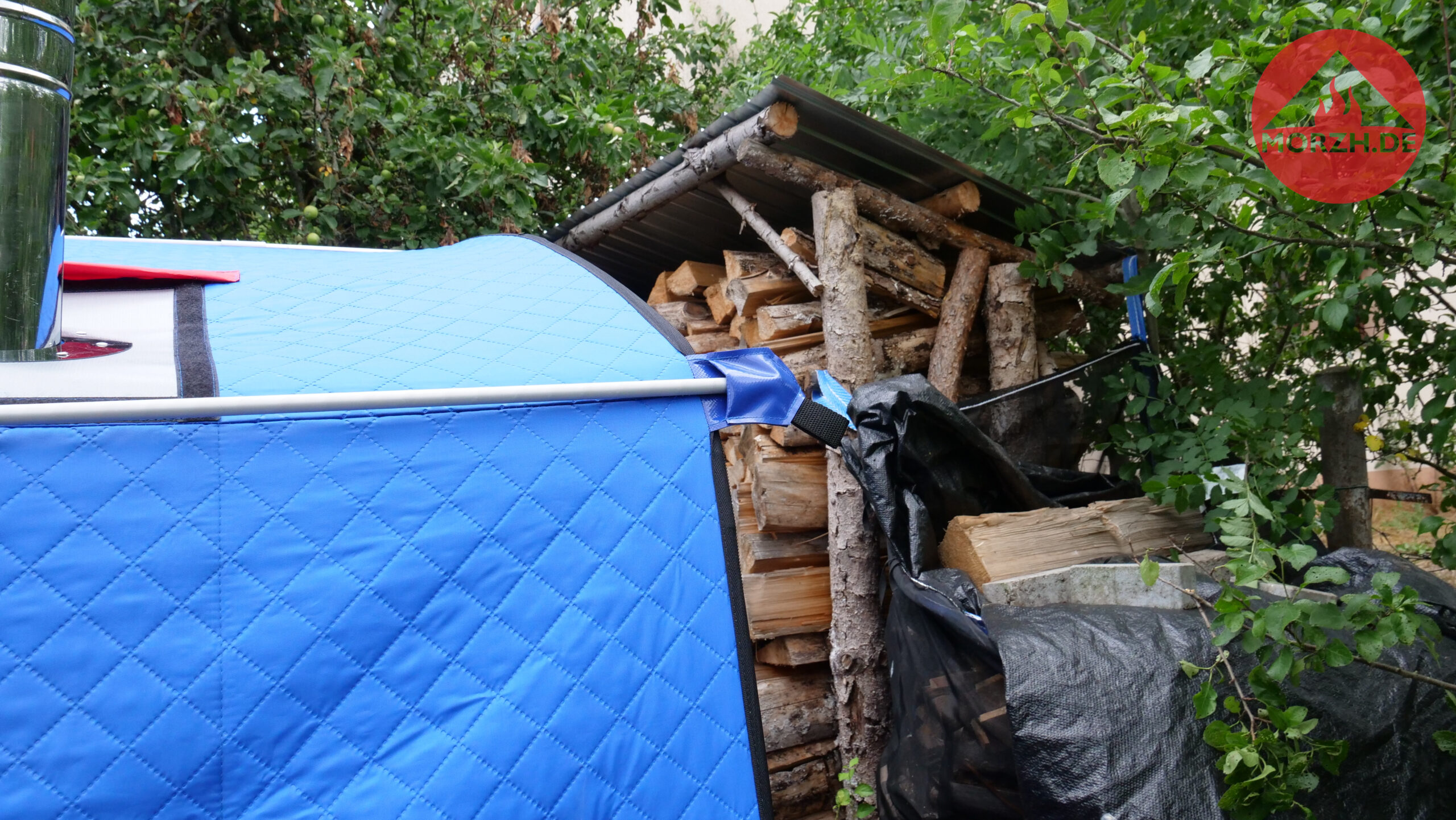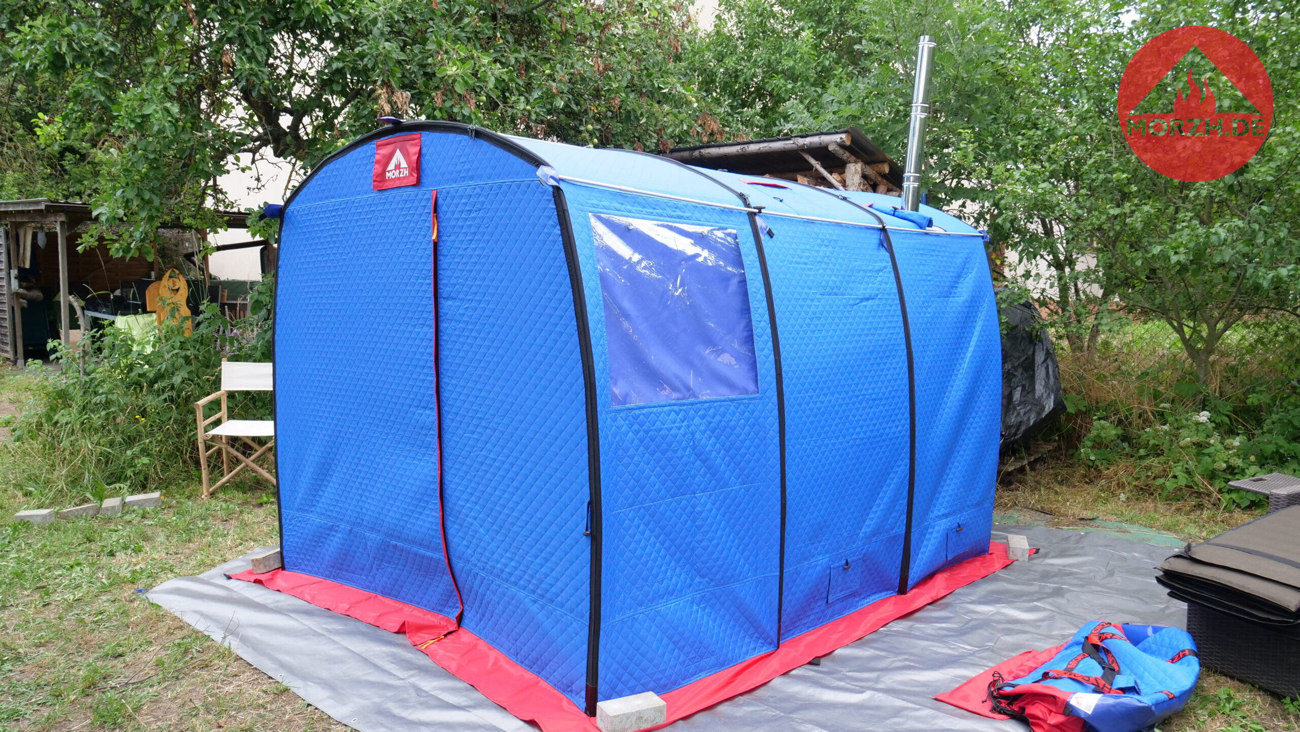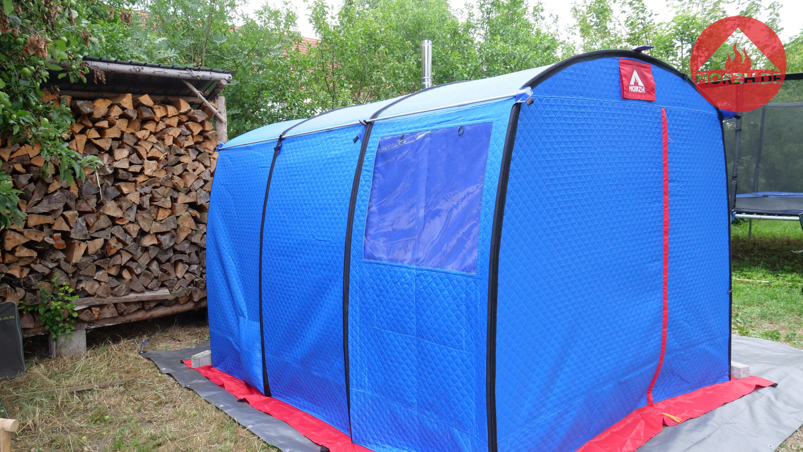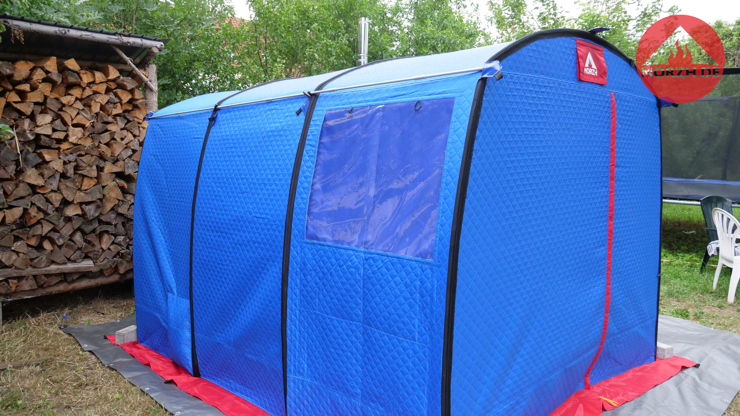 Auch bei diesem Zelt gibt es zwei große Fenster, um die Umgebung beim Sauniern geniessen zu können. Zum Camping würde ich die zusätzliche Dachplane für größere Regenfestigkeit empfehlen. Das optionale Steinrack ermöglicht mehr Steine und damit mehr Aufgussdampf.