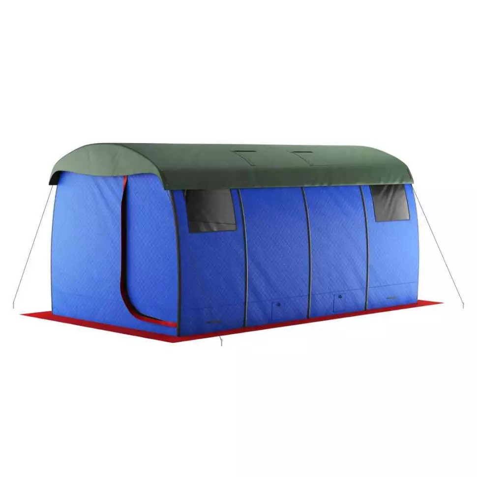 Die Dachplane erhöht die Wasserfestikeit, da aufgrund der technologischen Eigenschaften des dreischichtigen Materials die Nähte dieser Zelte an einigen Stellen nicht verklebt werden können. Zu empfehlen beim Campinggebrauch und längeren Standzeiten.