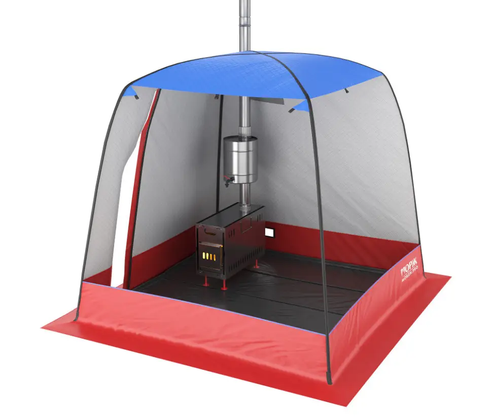 ist durch die doppelte würfelähnliche Form für bis 10 Personen geeignet. Die Konstruktion ermöglicht (sogar alleine) einen sehr einfachen Auf- und Abbau in unter 5 min. Der 3-lagige Stoff hat eine hervorragende Wärmedämmung, der hohe Temperaturen bis 100°C auch bei Minus-Graden im Freien ermöglicht. Durch die 4 dreieckigen Fenster kann das Meer, der See, die Berge oder der Garten bewundert werden, je nachdem wo mein Zelt gerade steht. Zur Wahrung der Privatsphäre können die Fenster bllickdicht geschlossen werden.. Die Anfeuerungszeit beträgt je nach Außentemperatur 25-40 min. Für ein schnelleres Aufheizen und Außentemperaturen unter -8°C empfiehlt sich die gleichzeitige Verwendung der Öfen Intent 2 und Fisher. Die zwei Eingänge liegen sich gegenüber. Zum Camping, mit dem optionalen Dauerbrandofen Fisher, gibt es eine extra Schornsteindurchführung um den Ofen platzsparender platzieren zu können. Beim Dauerbrandofen Fisher muss seltener nachgelegt werden und man kann die Temperatur besser regeln als beim Saunaofen Intent 2. Dieser hat dafür mehr Leistung und die Möglichkeit Saunasteine aufzubauen. Am besten geht das mit einem Steinrack (optional erhältlich). Das Zeltgestänge ist aus Glasfaser. Der Zeltstoff besteht aus Oxford 240, welches ein isolierendes, strapazierfähiges und leichtes Taffeta-Gewebe ist. Dieses wurde mit einem Verstärkungsgewebe versehen.Der Ofen Intent 2