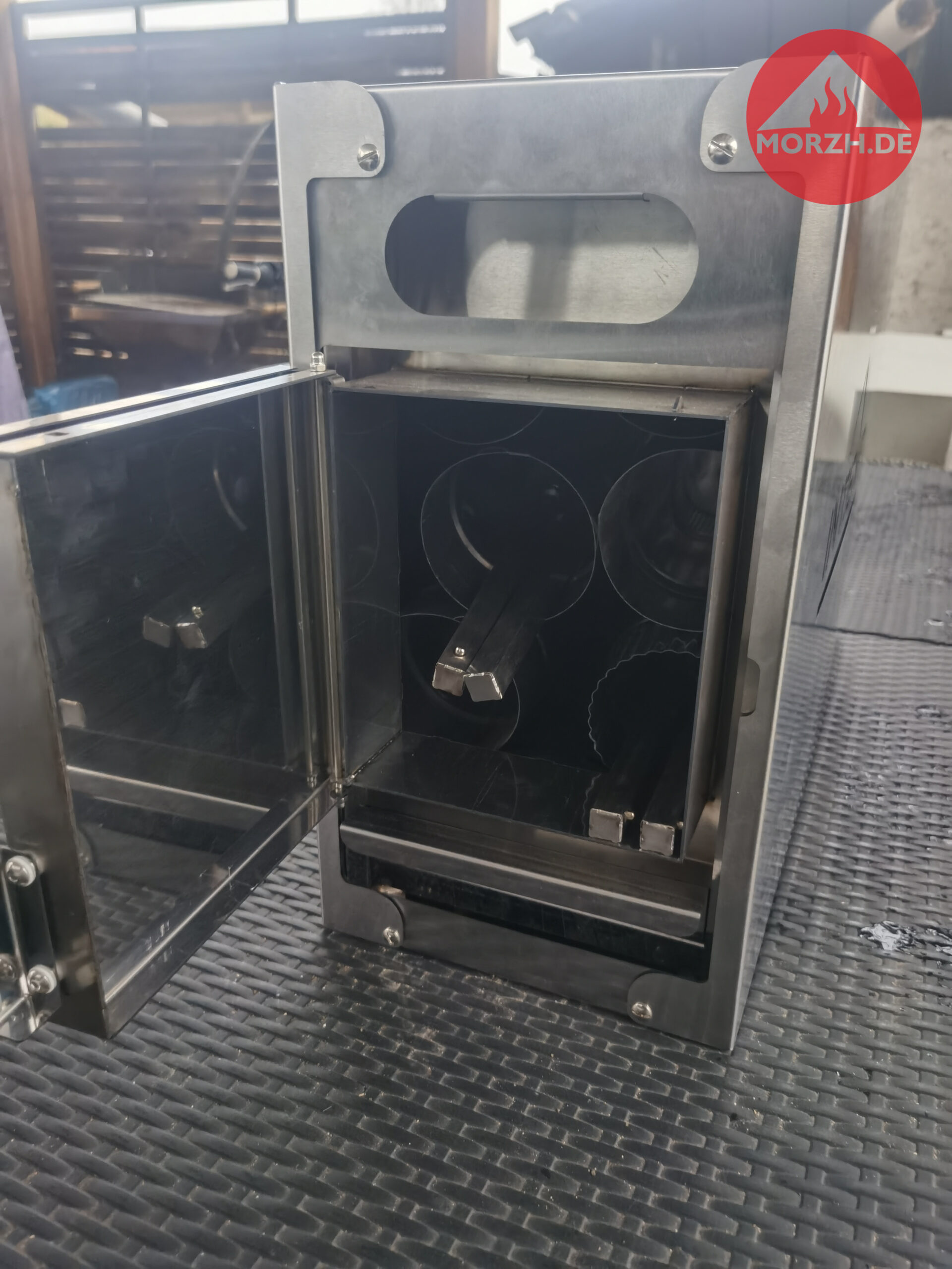 Der Ofen kan mit bis zu 20 kg Saunasteinen belastet werden. Dazu empfehle ich das Steinrack. Die integrierte Funkenfängerkammer schützt das Zelt und die Umwelt vor Feuerfunken.