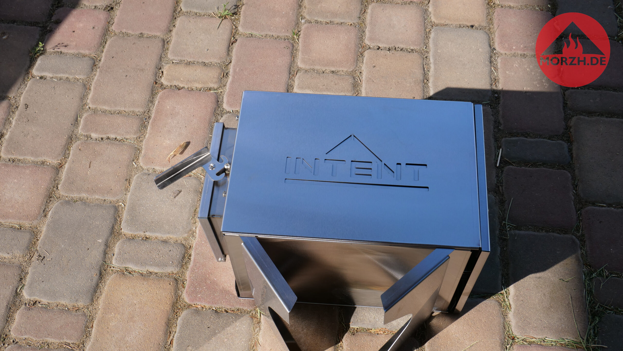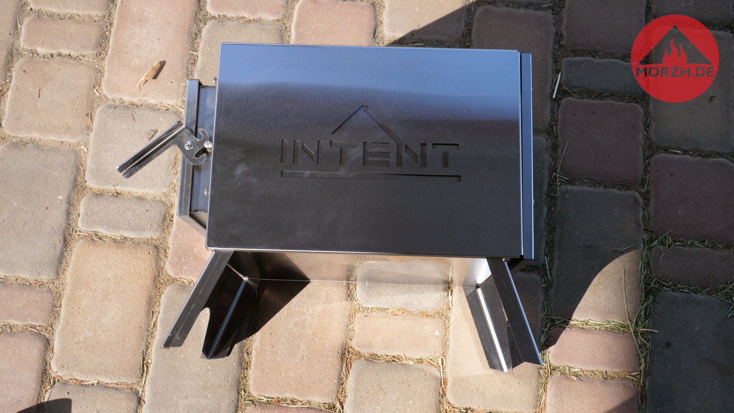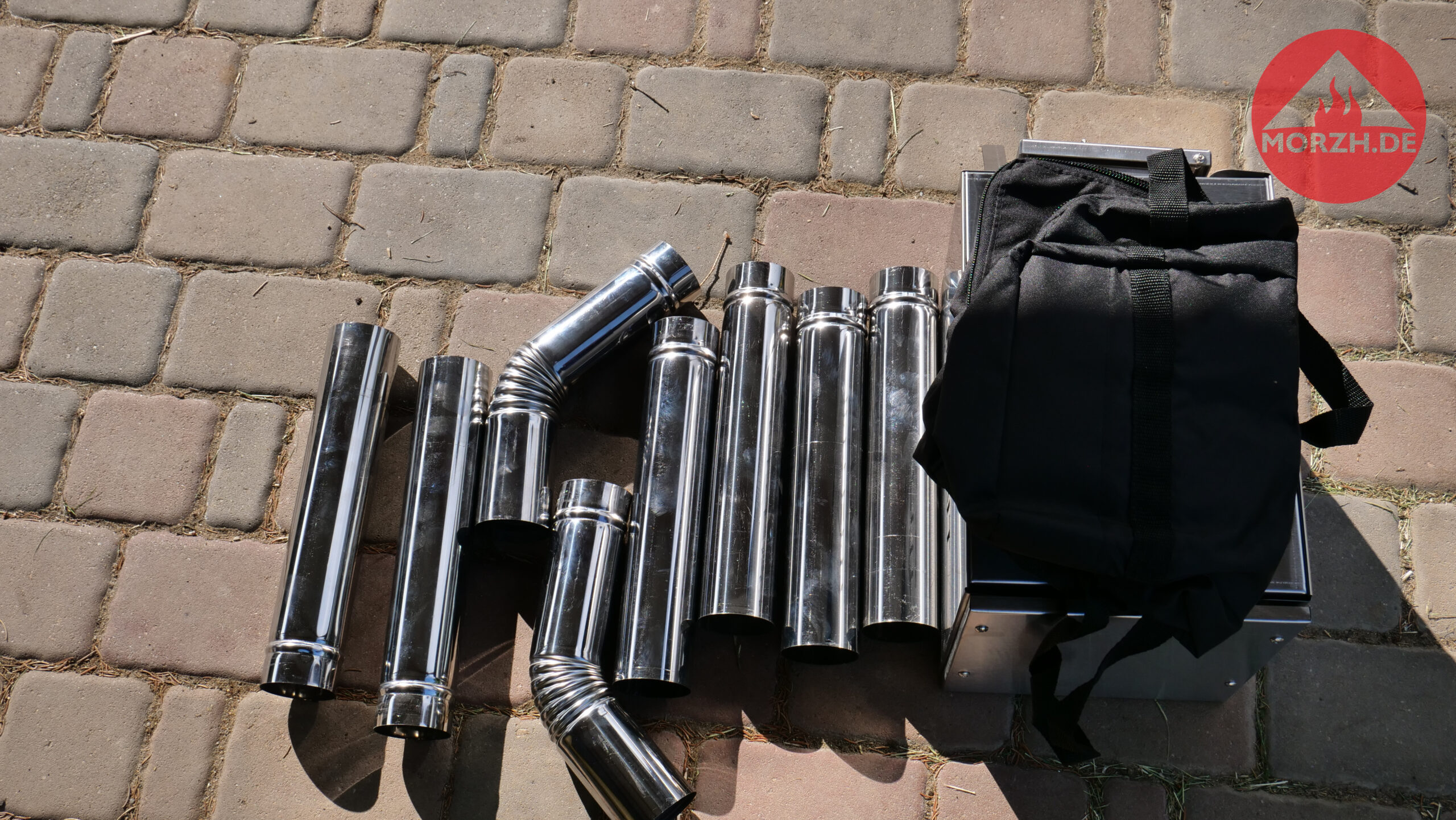 Die Beine sind einklappbar. Die Schornsteinsegmente passen zum Transport in den Brennraum. Zum Schutz für Zelte und Umwelt ist eine Funkenschutzkammer eingebaut.