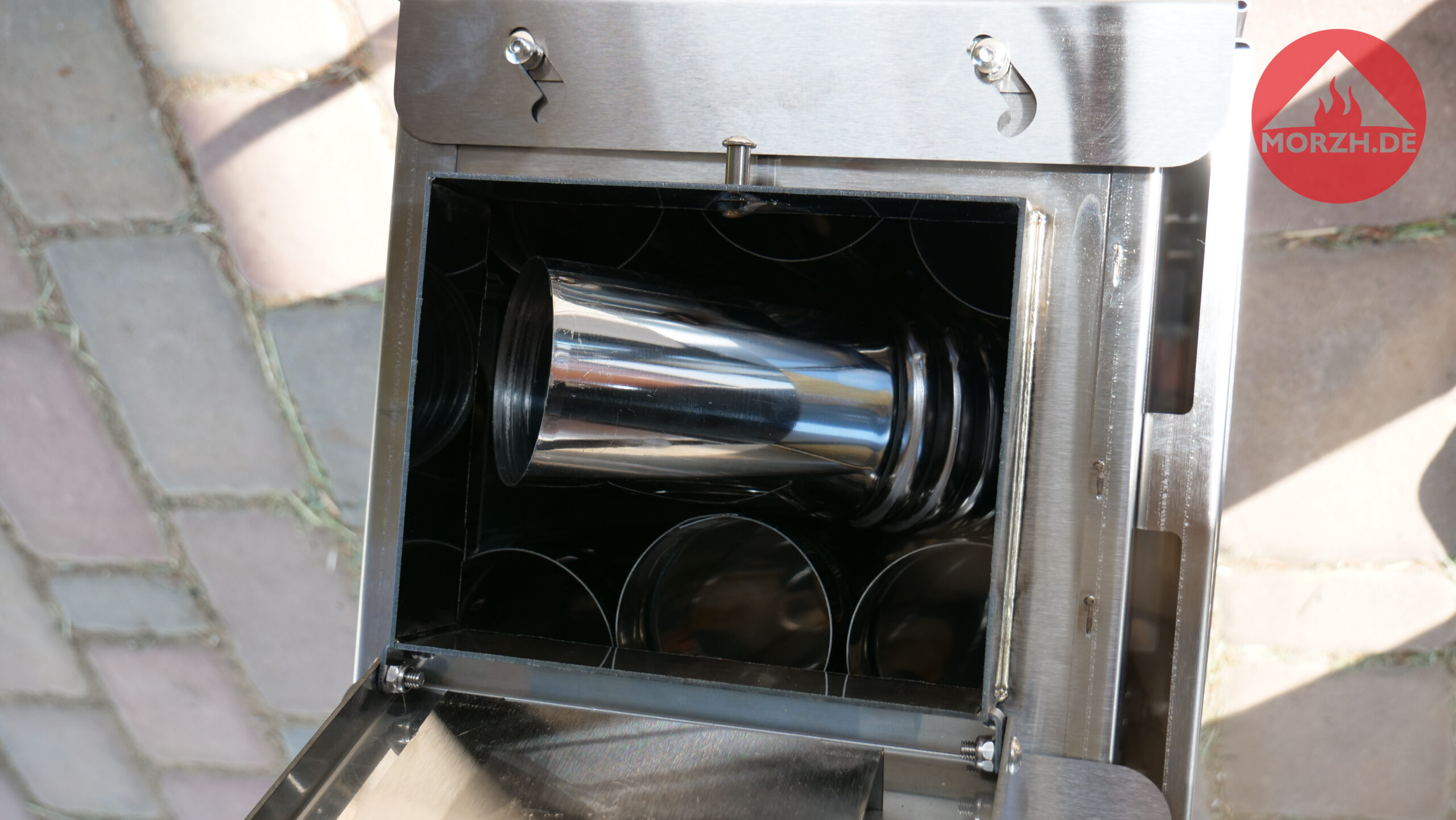 Hier kann die Zu- und Abluft besser gereglt werden als bei den Saunaöfen. Dadurch wird ein langsameres Abbrennen und eine niedrigere Temperatur erreicht, was z. B. beim Wintercampen erwünscht ist.